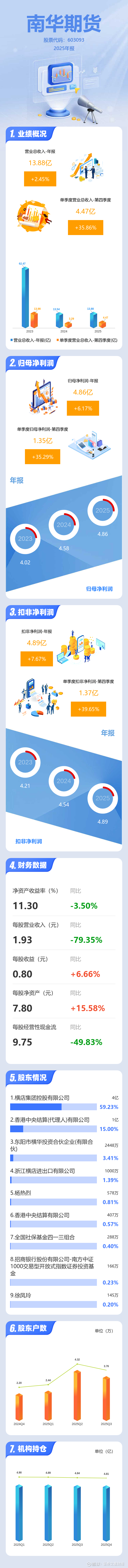 证券之星消息,南华期货2025年年报显示,当年度公司主营收入13.88亿元,同比上升2.45%;归母净利润4.86亿元,同比上升6.18%;扣非净利润4.89亿元,同比上升7.67%;其中2025年第四季度,公司单季度主营收入4.47亿元,同比上升35.87%;单季度归母净利润1.35亿元,同比上升35.3%;单季度扣非净利润1.37亿元,同比上升39.66%;负债率91.44%,投资收益1.16亿元。