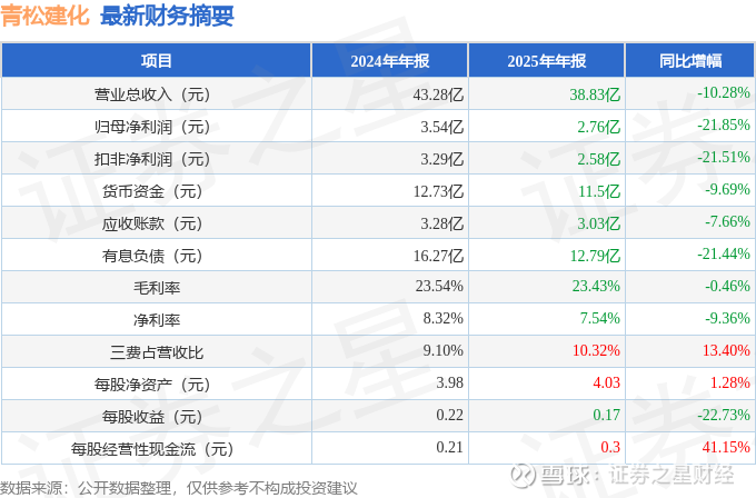 应收票据变动幅度为-31.77%,原因:营业收入同比下降导致收票金额减少,且应收票据背书转让用于采购支付的情况较上年增加,致使期末应收票据余额下降。预付款项变动幅度为-73.39%,原因:报告期采购预付款减少。其他权益工具投资变动幅度为-79.76%,原因:天盈石化持续亏损,且存在大额累计亏损,已严重资不抵债,将公允价值调整计为0。投资性房地产变动幅度为807.99%,原因:青松大厦办公楼已交付投入使用,预计出租。在建工程变动幅度为-45.17%,原因:上年末重点项目本期完工并转入固定资产。其他非流动资产变动幅度为-46.57%,原因:上期预付的办公楼购房款,本报告期已交付投入使用,转入固定资产、投资性房地产核算。短期借款变动幅度为-36.35%,原因:报告期偿还短期借款。一年内到期的非流动负债变动幅度为61.0%,原因:一年内到期的中长期借款增加。长期借款变动幅度为-40.88%,原因:长期借款中一年内到期的中长期借款转入一年内到期的非流动负债核算。递延收益变动幅度为33.76%,原因:收到的政府补助资金增加。营业收入变动幅度为-10.28%,原因:水泥市场行情下行,公司产品售价降低,同时销量也有所减少,导致整体收入同比下降。营业成本变动幅度为-10.16%,原因:随着销量下降,原材料采购及生产相关成本相应减少,成本降幅与收入降幅基本匹配。销售费用变动幅度为-2.78%,原因:销量减少,与之相关的销售人员薪酬、市场推广等投入相应缩减。管理费用变动幅度为2.7%,原因:社保缴费基数上调以及部分宿舍楼修缮,导致职工薪酬有所增加;上年新购置的无形资产在本期计提的摊销额增加,共同推高了管理费用。研发费用变动幅度为-1.61%,原因:本期研发投入略有缩减。经营活动产生的现金流量净额变动幅度为41.15%,原因:公司加强资金管理和经营性支出控制,实际收回的现金净额同比大幅增长。投资活动产生的现金流量净额变动幅度为49.2%,原因:本期收回的投资收益同比增加,同时购建固定资产等长期资产的投入有所减少,投资活动整体现金净流出同比收窄。筹资活动产生的现金流量净额变动幅度为-6.43%,原因:本期公司新增借款大幅减少,导致筹资流入的资金明显下降,而偿还债务的支出降幅相对筹资流入较小,使得筹资活动整体现金净流出进一步扩大。证券之星价投圈财报分析工具显示: