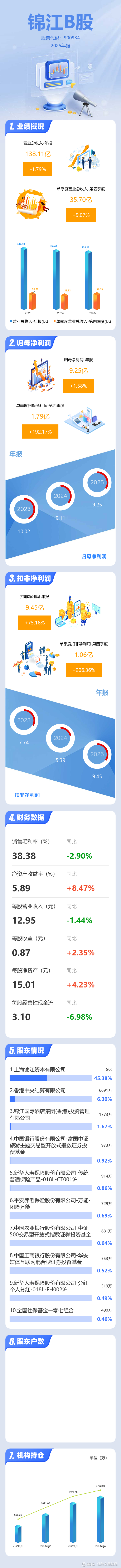 证券之星消息,锦江B股2025年年报显示,当年度公司主营收入138.11亿元,同比下降1.79%;归母净利润9.25亿元,同比上升1.58%;扣非净利润9.45亿元,同比上升75.19%;其中2025年第四季度,公司单季度主营收入35.7亿元,同比上升9.08%;单季度归母净利润1.79亿元,同比上升192.17%;单季度扣非净利润1.06亿元,同比上升206.36%;负债率64.55%,投资收益3.1亿元,财务费用6.35亿元,毛利率38.38%。