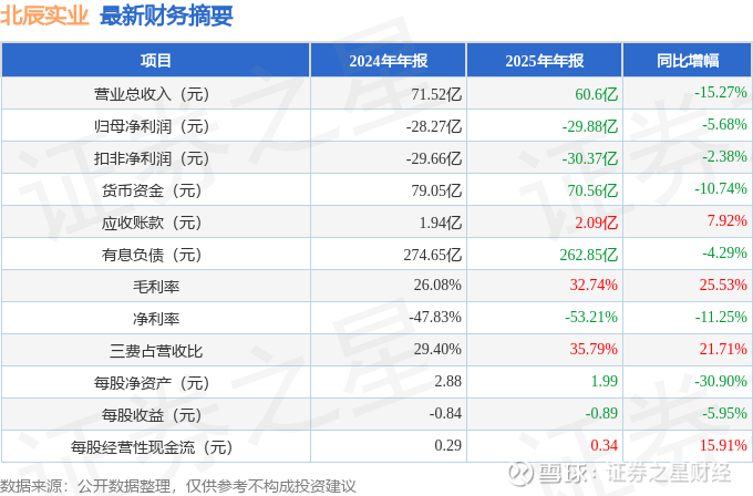 据证券之星公开数据整理,近期北辰实业(601588)发布2025年年报。根据财报显示,北辰实业净利润同比下降5.68%。截至本报告期末,公司营业总收入60.6亿元,同比下降15.27%,归母净利润-29.88亿元,同比下降5.68%。按单季度数据看,第四季度营业总收入16.94亿元,同比下降30.06%,第四季度归母净利润-8.14亿元,同比上升57.13%。