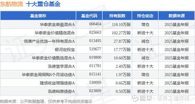 持有东航物流最多的基金为华泰紫金泰盈混合A,目前规模为1.62亿元,最新净值1.4924(3月27日),较上一交易日上涨0.84%,近一年上涨11.38%。该基金现任基金经理为查晓磊。