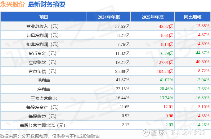 据证券之星公开数据整理,近期永兴股份(601033)发布2025年年报。截至本报告期末,公司营业总收入42.87亿元,同比上升13.88%,归母净利润8.61亿元,同比上升4.87%。按单季度数据看,第四季度营业总收入10.37亿元,同比上升6.9%,第四季度归母净利润1.15亿元,同比下降33.28%。本报告期永兴股份应收账款上升,应收账款同比增幅达40.6%。