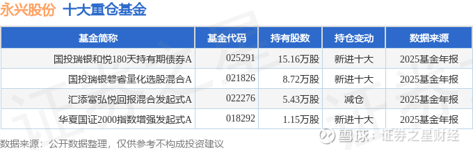 持有永兴股份最多的基金为国投瑞银和悦180天持有期债券A,目前规模为4.82亿元,最新净值1.0068(3月27日),较上一交易日上涨0.1%。该基金现任基金经理为李达夫 殷瑞飞。