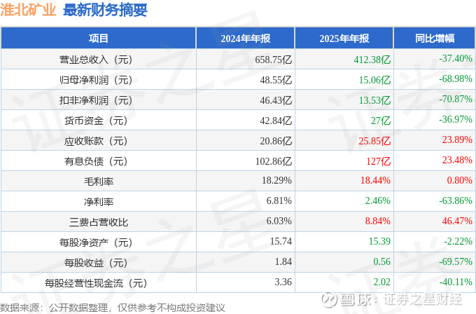 据证券之星公开数据整理,近期淮北矿业(600985)发布2025年年报。截至本报告期末,公司营业总收入412.38亿元,同比下降37.4%,归母净利润15.06亿元,同比下降68.98%。按单季度数据看,第四季度营业总收入93.13亿元,同比上升2.46%,第四季度归母净利润4.36亿元,同比下降39.17%。本报告期淮北矿业公司应收账款体量较大,当期应收账款占最新年报归母净利润比达171.62%。