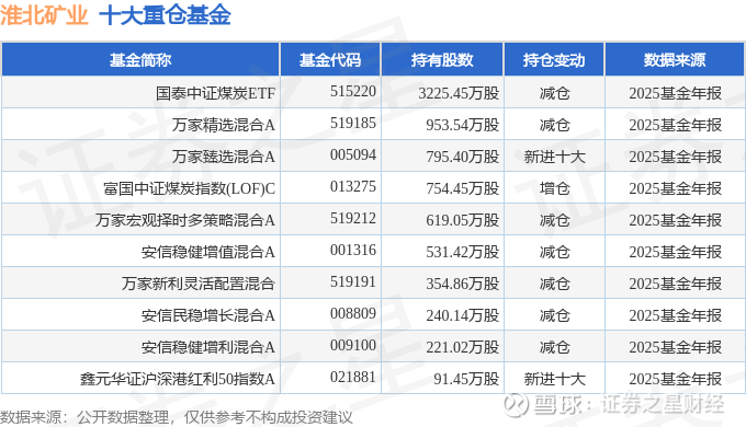 持有淮北矿业最多的基金为国泰中证煤炭ETF,目前规模为86.4亿元,最新净值1.2746(3月27日),较上一交易日下跌0.43%,近一年上涨26.89%。该基金现任基金经理为吴中昊。
