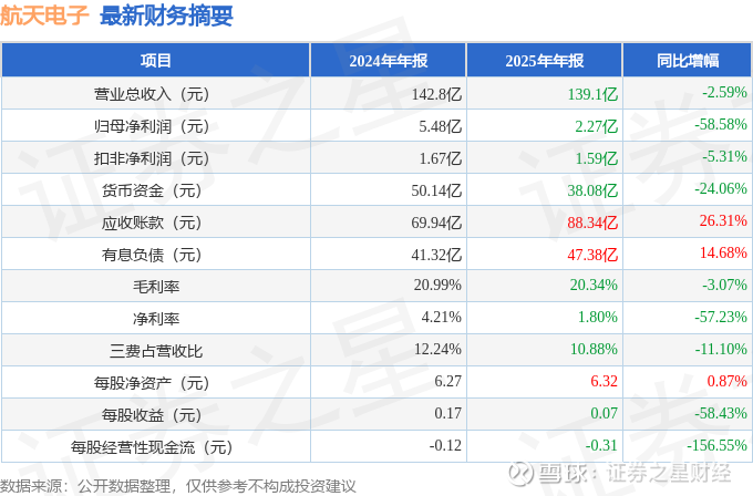 应收票据变动幅度为58.33%,原因:期末持有的信用等级较低的银行承兑汇票及商业汇票增加。应收款项变动幅度为26.31%,原因:客户付款政策发生变化,销售回款减少。其他应收款变动幅度为-34.48%,原因:往来款减少。其他流动资产变动幅度为-83.31%,原因:期末定期存款减少。其他权益工具投资变动幅度为49.76%,原因:北京神舟航天软件技术股份有限公司公允价值增加。使用权资产变动幅度为-33.02%,原因:本报告期租赁的房屋建筑物、设备等资产折旧摊销。开发支出变动幅度为-96.29%,原因:开发支出转出。长期待摊费用变动幅度为182.13%,原因:厂房维修改造支出增加。递延所得税资产变动幅度为-23.51%,原因:本报告期末递延所得税资产、递延所得税负债按照抵消后金额列示。其他非流动资产变动幅度为260.61%,原因:本报告期期末预付长期资产购置款增加。应付账款变动幅度为22.38%,原因:本报告期订单任务增加,备货。应交税费变动幅度为-15.71%,原因:应交增值税与企业所得税减少。其他应付款变动幅度为-17.79%,原因:往来款减少。一年内到期的非流动负债变动幅度为37.03%,原因:重分类至一年内到期的非流动负债的租赁负债及长期借款增加。其他流动负债变动幅度为-26.08%,原因:超短期融资减少。长期借款的变动原因:本报告期借款增加。租赁负债变动幅度为-38.65%,原因:本报告期偿还租金。长期应付款变动幅度为-94.19%,原因:本报告期国家专项拨款减少。预计负债变动幅度为-100.0%,原因:本报告期已支付相关诉讼事项。递延所得税负债变动幅度为-100.0%,原因:本报告期末递延所得税资产、递延所得税负债按照抵消后金额列示。营业收入变动幅度为-2.59%,原因:航天电工未纳入合并范围导致;上年度剔除航天电工因素影响,实际本报告期营业收入较上年度增加13.78%。营业成本变动幅度为-1.8%,原因:营业收入规模减少导致营业成本规模同比减少。销售费用变动幅度为-33.26%,原因:航天电工未纳入合并范围导致;上年度剔除航天电工因素影响,实际本报告期销售费用较上年度减少5.26%,报告期内职工薪酬减少。管理费用变动幅度为-7.17%,原因:职工薪酬减少。财务费用变动幅度为-25.56%,原因:航天电工未纳入合并范围导致;上年度剔除航天电工因素影响,实际本报告期财务费用较上年度减少4.13%,报告期内借款利息减少。研发费用变动幅度为-3.98%,原因:航天电工未纳入合并范围导致;上年度剔除航天电工因素影响,实际本报告期研发费用较上年度增加5.41%。经营活动产生的现金流量净额变动幅度为-156.55%,原因:客户付款政策发生变化,销售商品收到现金流减少;同时购买商品支付的现金流出增加。投资活动产生的现金流量净额变动幅度为5791.79%,原因:定期存款减少,受限资金减少。筹资活动产生的现金流量净额变动幅度为-134.62%,原因:取得借款现金流较上年度大幅度减少。证券之星价投圈财报分析工具显示: