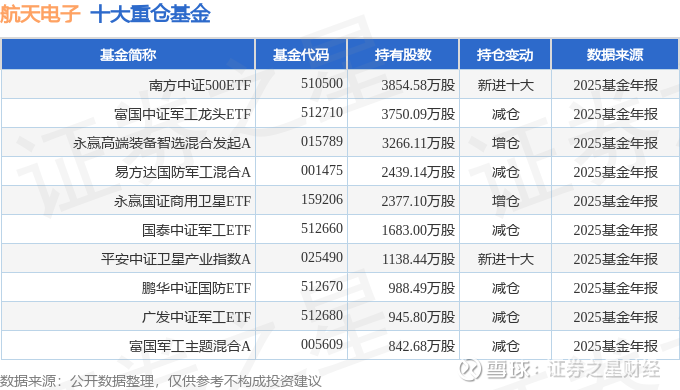 持有航天电子最多的基金为南方中证500ETF,目前规模为446.9亿元,最新净值7.8013(3月27日),较上一交易日上涨1.26%,近一年上涨32.0%。该基金现任基金经理为罗文杰。