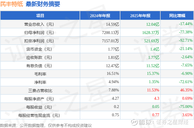 据证券之星公开数据整理,近期民丰特纸(600235)发布2025年年报。截至本报告期末,公司营业总收入12.04亿元,同比下降17.44%,归母净利润1628.37万元,同比下降77.38%。按单季度数据看,第四季度营业总收入3.16亿元,同比上升6.85%,第四季度归母净利润-235.74万元,同比下降121.38%。本报告期民丰特纸三费占比上升明显,财务费用、销售费用和管理费用总和占总营收同比增幅达46.35%。
