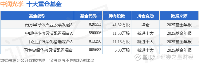 持有中润光学最多的基金为南方半导体产业股票发起A,目前规模为1.13亿元,最新净值2.1698(3月27日),较上一交易日上涨1.73%,近一年上涨49.83%。该基金现任基金经理为郑晓曦。