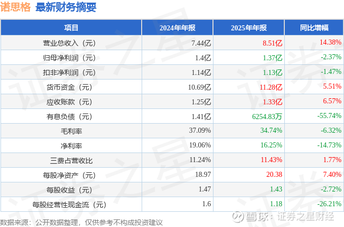 据证券之星公开数据整理,近期诺思格(301333)发布2025年年报。截至本报告期末,公司营业总收入8.51亿元,同比上升14.38%,归母净利润1.37亿元,同比下降2.37%。按单季度数据看,第四季度营业总收入2.44亿元,同比上升33.81%,第四季度归母净利润4133.28万元,同比下降25.93%。本报告期诺思格公司应收账款体量较大,当期应收账款占最新年报归母净利润比达97.49%。