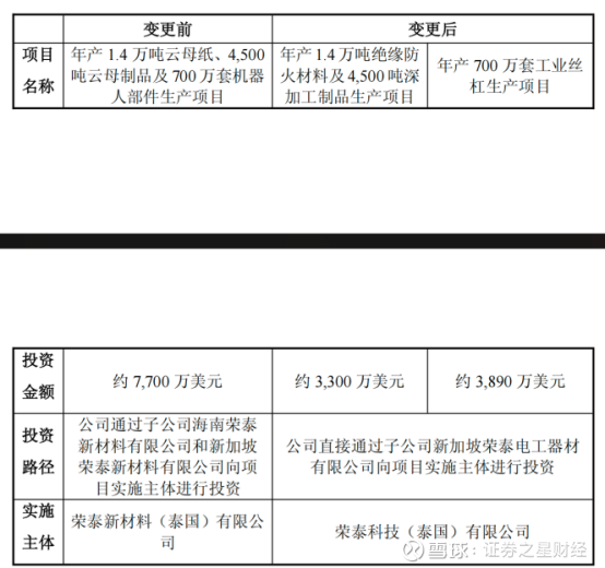 根据公告,原"年产1.4万吨云母纸、4500吨云母制品及700万套机器人部件生产项目"被拆分为两个独立项目:"年产1.4万吨绝缘防火材料及4500吨深加工制品生产项目"和"年产700万套工业丝杠生产项目"。投资总额由约7700万美元调减至7190万美元,实施主体也由原荣泰(泰国)精密工业有限公司,变更为荣泰(泰国)精密工业有限公司与荣泰(泰国)电气有限公司两家主体。