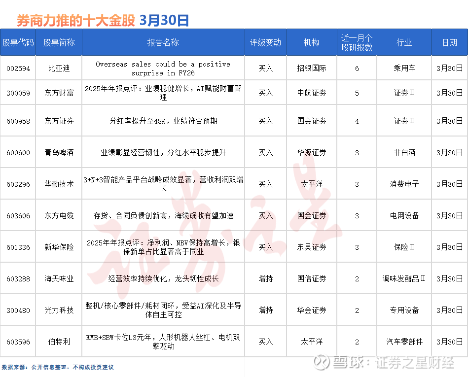 比亚迪最受券商关注,近一个月获东吴证券、爱建证券、华金证券、开源证券等6份券商研报关注,位居3月30日券商力推股榜首。
