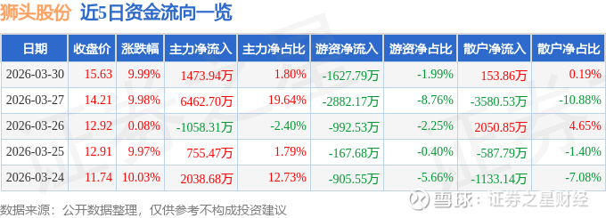 证券之星消息,狮头股份3月30日涨停收盘,收盘价15.63元。该股于10点13分涨停,28次打开涨停,截止收盘封单资金为434.33万元,占其流通市值0.12%。