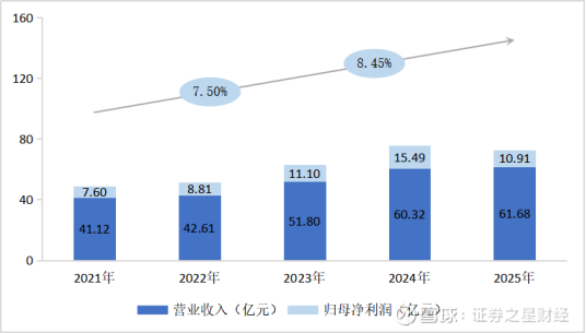 3月28日,天坛生物(600161.SH)发布2025年年度报告,全年实现营业收入61.68亿元,在“十四五”期间增加20.56亿元,5年复合增长率为8.45%;归母净利润10.91亿元,5年复合增长7.50%。