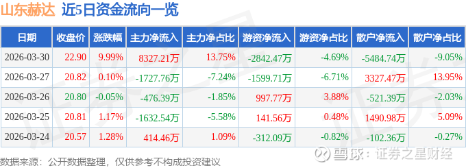 证券之星消息,山东赫达3月30日涨停收盘,收盘价22.9元。该股于9点25分涨停,2次打开涨停,截止收盘封单资金为6449.35万元,占其流通市值0.87%。