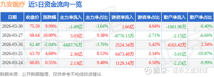 证券之星消息,九安医疗3月30日涨停收盘,收盘价75.5元。该股于13点23分涨停,3次打开涨停,截止收盘封单资金为2447.69万元,占其流通市值0.07%。