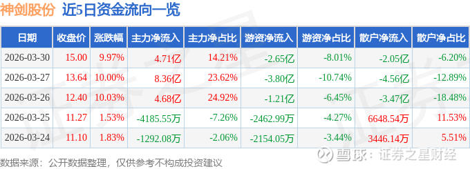 证券之星消息,神剑股份3月30日涨停收盘,收盘价15.0元。该股于10点29分涨停,未打开涨停,截止收盘封单资金为2.86亿元,占其流通市值2.36%。