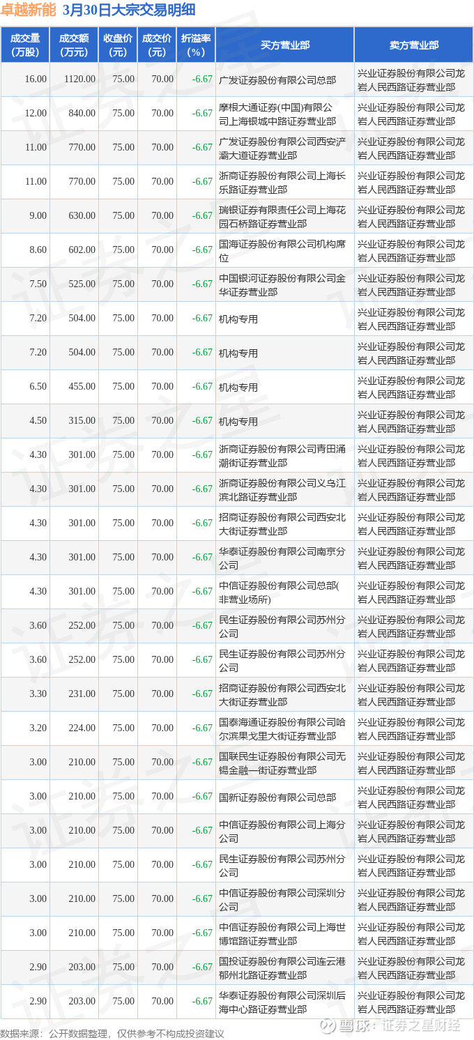 证券之星消息,3月30日卓越新能发生大宗交易,交易数据如下: