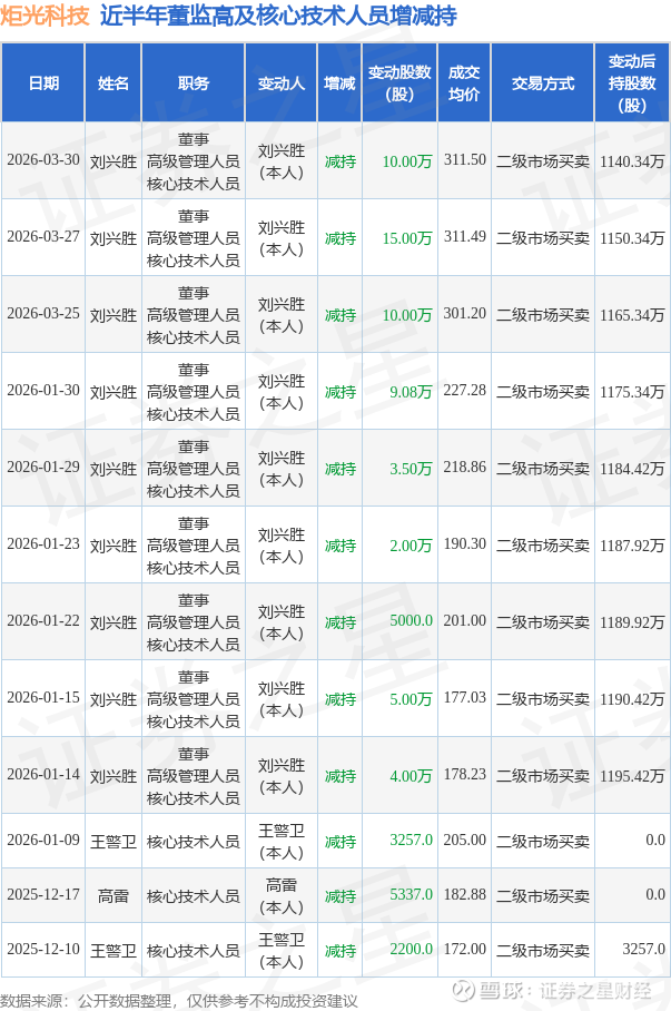 证券之星消息,根据3月30日市场公开信息、上市公司公告及交易所披露数据整理,炬光科技(688167)最新董监高及相关人员股份变动情况:2026年3月27日至2026年3月30日公司董事,高级管理人员,核心技术人员刘兴胜共减持公司股份25.0万股,占公司总股本为0.2782%。变动期间公司股价上涨3.19%,3月30日当日收盘报347.52元。