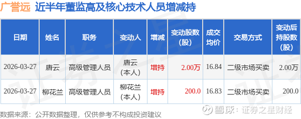 证券之星消息,根据3月30日市场公开信息、上市公司公告及交易所披露数据整理,广誉远(600771)最新董监高及相关人员股份变动情况:2026年3月27日公司高级管理人员柳花兰、高级管理人员唐云共增持公司股份2.02万股,占公司总股本为0.0042%。变动期间公司股价上涨6.09%,3月27日当日收盘报16.89元。