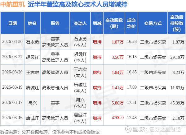 证券之星消息,根据3月30日市场公开信息、上市公司公告及交易所披露数据整理,中航重机(600765)最新董监高及相关人员股份变动情况:2026年3月30日公司董事,高级管理人员石永勇共增持公司股份1.87万股,占公司总股本为0.0012%。变动期间公司股价上涨0.24%,3月30日当日收盘报16.41元。