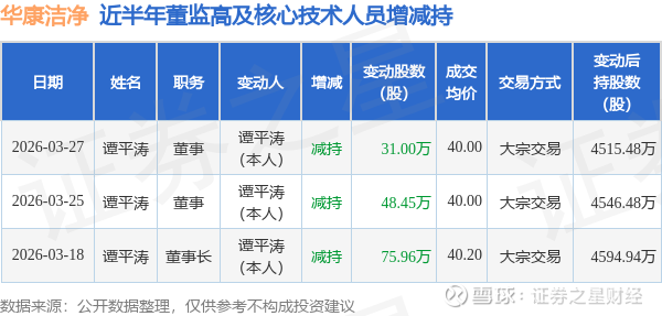 证券之星消息,根据3月30日市场公开信息、上市公司公告及交易所披露数据整理,华康洁净(301235)最新董监高及相关人员股份变动情况:2026年3月27日公司董事谭平涛共减持公司股份31.0万股,占公司总股本为0.2876%。变动期间公司股价下跌0.73%,3月27日当日收盘报48.95元。