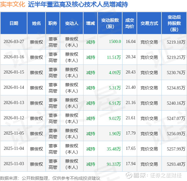 实丰文化近半年内的董监高及核心技术人员增减持详情如下: