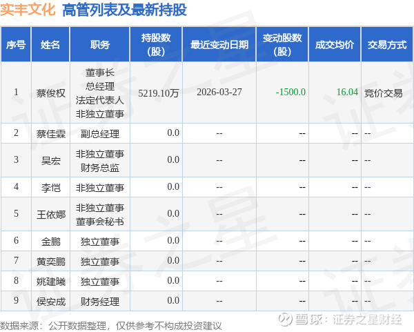 证券之星消息,根据3月30日市场公开信息、上市公司公告及交易所披露数据整理,实丰文化(002862)最新董监高及相关人员股份变动情况:2026年3月27日公司董事,高管蔡俊权共减持公司股份1500.0股,占公司总股本为0.0009%。变动期间公司股价上涨1.19%,3月27日当日收盘报16.16元。