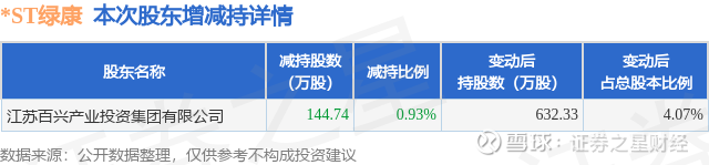 证券之星消息,3月30日*ST绿康发布公告《*ST绿康:关于持股5%以上股东股份减持计划实施完毕的公告》,其股东江苏百兴产业投资集团有限公司于2026年1月1日至2026年3月25日间合计减持144.74万股,占公司目前总股本的0.9313%,变动期间该股股价上涨12.64%,截止3月25日收盘报37.97元。