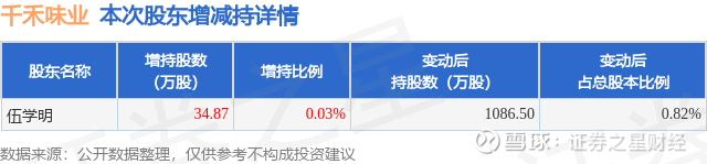证券之星消息,3月30日千禾味业发布公告《千禾味业:千禾味业关于持股5%以上股东及其一致行动人权益变动触及1%及5%刻度的提示性公告》,其股东伍学明于2026年3月27日合计增持34.87万股,占公司目前总股本的0.0262%,变动期间该股股价上涨6.56%,截止3月27日收盘报9.59元。