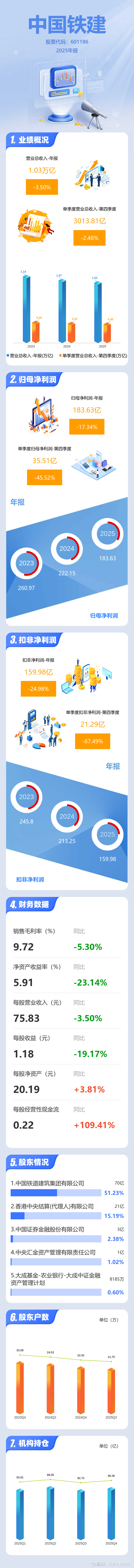 证券之星消息,中国铁建2025年年报显示,当年度公司主营收入10297.84亿元,同比下降3.5%;归母净利润183.63亿元,同比下降17.34%;扣非净利润159.98亿元,同比下降24.98%;其中2025年第四季度,公司单季度主营收入3013.81亿元,同比下降2.48%;单季度归母净利润35.51亿元,同比下降45.53%;单季度扣非净利润21.29亿元,同比下降67.5%;负债率79.51%,投资收益5.78亿元,财务费用109.72亿元,毛利率9.72%。