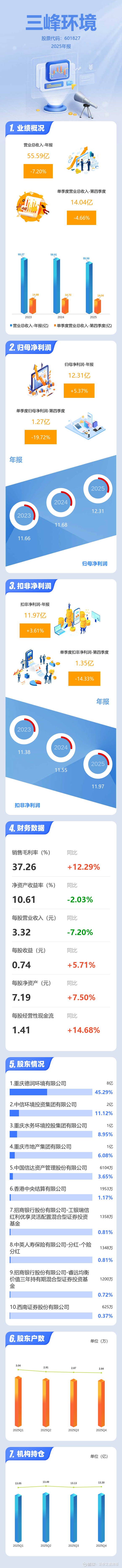 证券之星消息,三峰环境2025年年报显示,当年度公司主营收入55.59亿元,同比下降7.21%;归母净利润12.31亿元,同比上升5.38%;扣非净利润11.97亿元,同比上升3.61%;其中2025年第四季度,公司单季度主营收入14.04亿元,同比下降4.67%;单季度归母净利润1.27亿元,同比下降19.72%;单季度扣非净利润1.35亿元,同比下降14.34%;负债率48.92%,投资收益8237.84万元,财务费用2.51亿元,毛利率37.26%。