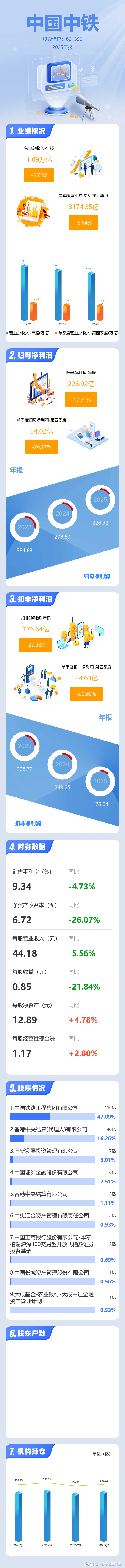 证券之星消息,中国中铁2025年年报显示,当年度公司主营收入10934.94亿元,同比下降5.76%;归母净利润228.92亿元,同比下降17.91%;扣非净利润176.64亿元,同比下降27.38%;其中2025年第四季度,公司单季度主营收入3174.35亿元,同比下降6.64%;单季度归母净利润54.02亿元,同比下降26.18%;单季度扣非净利润24.63亿元,同比下降53.65%;负债率78.12%,投资收益22.56亿元,财务费用89.83亿元,毛利率9.34%。
