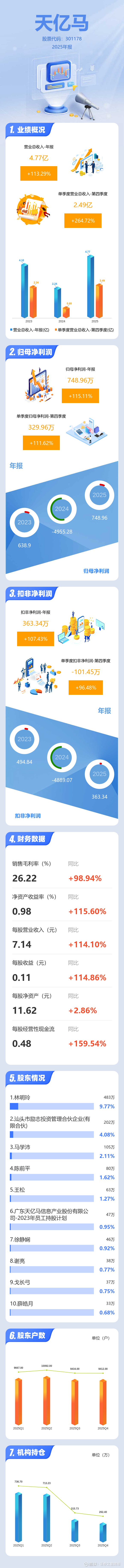 证券之星消息,天亿马2025年年报显示,当年度公司主营收入4.77亿元,同比上升113.29%;归母净利润748.96万元,同比上升115.11%;扣非净利润363.34万元,同比上升107.43%;其中2025年第四季度,公司单季度主营收入2.49亿元,同比上升264.73%;单季度归母净利润329.96万元,同比上升111.62%;单季度扣非净利润-101.45万元,同比上升96.49%;负债率45.39%,投资收益546.78万元,财务费用1130.9万元,毛利率26.22%。