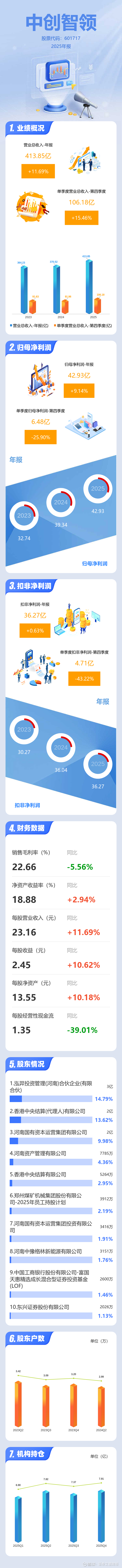 证券之星消息,中创智领2025年年报显示,当年度公司主营收入413.85亿元,同比上升11.69%;归母净利润42.93亿元,同比上升9.14%;扣非净利润36.27亿元,同比上升0.64%;其中2025年第四季度,公司单季度主营收入106.18亿元,同比上升15.47%;单季度归母净利润6.48亿元,同比下降25.91%;单季度扣非净利润4.71亿元,同比下降43.22%;负债率51.48%,投资收益4014.23万元,财务费用2.37亿元,毛利率22.66%。