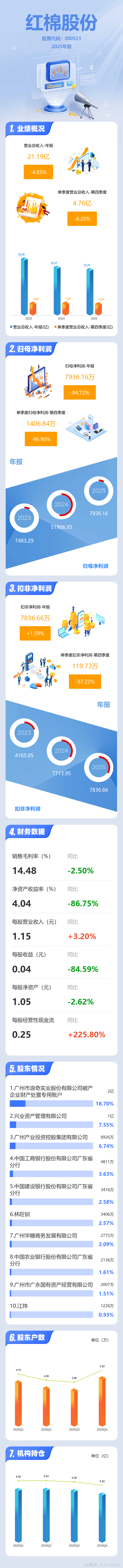 证券之星消息,红棉股份2025年年报显示,当年度公司主营收入21.19亿元,同比下降4.86%;归母净利润7936.16万元,同比下降84.73%;扣非净利润7836.66万元,同比上升1.59%;其中2025年第四季度,公司单季度主营收入4.76亿元,同比下降6.2%;单季度归母净利润1406.84万元,同比下降96.91%;单季度扣非净利润119.73万元,同比下降87.22%;负债率38.88%,投资收益1838.01万元,财务费用2208.68万元,毛利率14.48%。