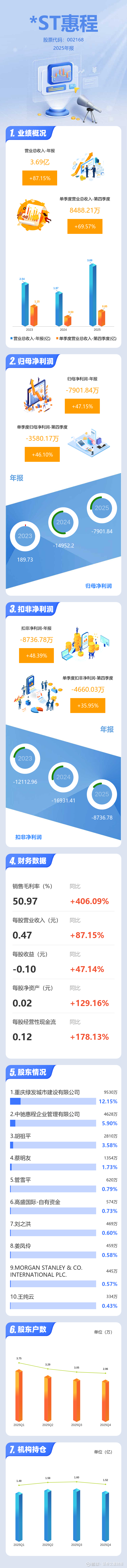 证券之星消息,*ST惠程2025年年报显示,当年度公司主营收入3.69亿元,同比上升87.16%;归母净利润-7901.84万元,同比上升47.15%;扣非净利润-8736.78万元,同比上升48.4%;其中2025年第四季度,公司单季度主营收入8488.21万元,同比上升69.58%;单季度归母净利润-3580.17万元,同比上升46.1%;单季度扣非净利润-4660.03万元,同比上升35.96%;负债率92.71%,投资收益567.29万元,财务费用2055.61万元,毛利率50.97%。