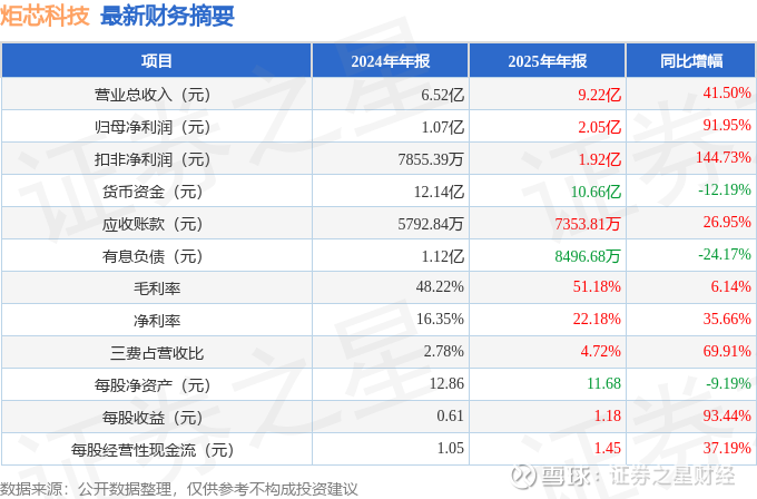 财务费用变动幅度为38.87%,原因:本年利息收入减少,汇兑损失增加。经营活动产生的现金流量净额变动幅度为64.45%,原因:本年公司营业收入大幅增长,销售商品收到的货款较上年同期增加。投资活动产生的现金流量净额变动幅度为-392.25%,原因:上年末部分理财到期赎回的闲置资金,于本期购买理财产品,本期支付的金额大幅增加。筹资活动产生的现金流量净额变动幅度为-350.72%,原因:本年公司对集团内子公司开立的银行承兑汇票到期还款所支付的现金增加,以及本年度现金分红增加。交易性金融资产变动幅度为37.0%,原因:本期购买的收益凭证、净值型理财等理财产品增加。预付款项变动幅度为800.74%,原因:本期向供应商预付货款增加。其他流动资产变动幅度为476.82%,原因:本期使用闲置资金购买国债逆回购以及待抵扣的增值税进项税增加。其他权益工具投资变动幅度为-61.64%,原因:本期公司持有炬迪(上海)科技有限公司的投资因新的股东协议条款发生实质性变更,不再满足权益工具定义,原其他权益工具投资于变更日终止确认,重新确认为以公允价值计量且其变动计入当期损益的金融资产。其他非流动资产变动幅度为456.57%,原因:本期新增持有一年以上大额存单。应付票据变动幅度为180.58%,原因:本期公司使用银行承兑汇票支付采购货款增加。合同负债变动幅度为-66.07%,原因:本期预收客户货款发货冲销后减少。应付职工薪酬变动幅度为50.11%,原因:计提年终奖增加。应交税费变动幅度为81.84%,原因:应交增值税增加。其他应付款变动幅度为35.88%,原因:应付销售返利增加。其他流动负债变动幅度为-61.59%,原因:预收客户货款发货后销项税转销。租赁负债变动幅度为50.65%,原因:本期新增租赁合同。递延所得税负债变动幅度为285.38%,原因:交易性金融资产公允价值变动确认的递延所得税负债。营业收入变动幅度为41.5%,原因:在端侧产品AI化的行业浪潮驱动下,公司产品矩阵协同效应显著:端侧AI处理器芯片应用于头部音频品牌的高端音箱、Party音箱等产品,终端渗透率快速提升,带动相关收入实现倍数增长;低延迟高音质无线音频产品需求持续强劲,销售额保持高速增长;蓝牙音箱SoC芯片系列在头部音频品牌中的份额稳步提升,客户合作向更高价值与更深层次演进,推动公司营业收入快速增长。营业成本变动幅度为33.4%,原因:本年营业收入大幅增长。证券之星价投圈财报分析工具显示: