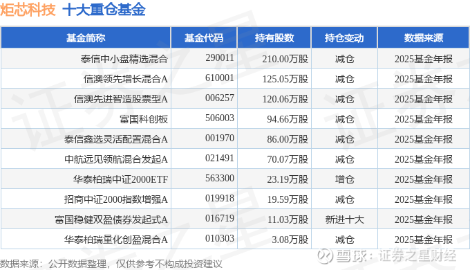 持有炬芯科技最多的基金为泰信中小盘精选混合,目前规模为14.52亿元,最新净值4.039(3月30日),较上一交易日下跌0.37%,近一年上涨6.18%。该基金现任基金经理为董季周。