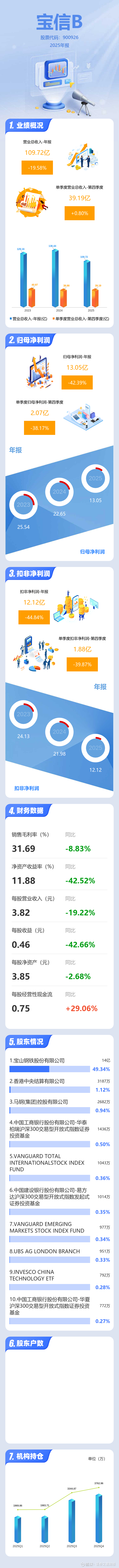 证券之星消息,宝信B2025年年报显示,当年度公司主营收入109.72亿元,同比下降19.59%;归母净利润13.05亿元,同比下降42.4%;扣非净利润12.12亿元,同比下降44.84%;其中2025年第四季度,公司单季度主营收入39.19亿元,同比上升0.8%;单季度归母净利润2.07亿元,同比下降38.18%;单季度扣非净利润1.88亿元,同比下降39.87%;负债率46.47%,投资收益922.67万元,财务费用-1711.47万元,毛利率31.69%。