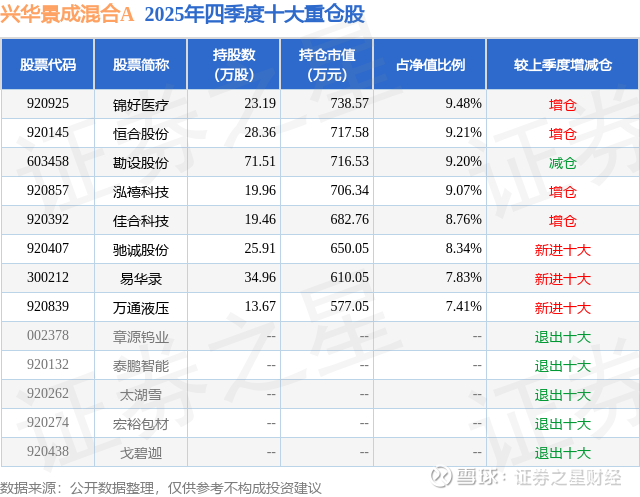 根据2025基金年报公募基金重仓股数据,重仓该股的公募基金共3家,其中持有数量最多的公募基金为兴华基金的兴华景成混合A。兴华景成混合A目前规模为0.69亿元,最新净值1.0657(3月31日),较上一交易日下跌0.45%。该公募基金现任基金经理为崔涛 吕智卓 胡玺潮 黄生鹏。吕智卓在任的基金产品包括:兴华安盈一年定开债券发起式,管理时间为2021年8月4日至今,期间收益率为18.11%;兴华安悦纯债A,管理时间为2022年10月19日至今,期间收益率为10.11%;兴华安聚纯债A,管理时间为2023年4月26日至今,期间收益率为15.84%;兴华安惠纯债A,管理时间为2023年6月20日至今,期间收益率为9.46%。崔涛在任的基金产品包括:兴华景和混合发起A,管理时间为2025年6月12日至今,期间收益率为39.66%;黄生鹏在任的基金产品包括:兴华景和混合发起A,管理时间为2025年10月21日至今,期间收益率为21.87%;胡玺潮在任的基金产品包括:兴华景明混合A,管理时间为2025年9月22日至今,期间收益率为6.93%;兴华兴利债券A,管理时间为2025年10月9日至今,期间收益率为-0.57%;兴华景睿混合发起A,管理时间为2026年2月10日至今,期间收益率为-2.54%。