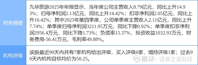 2026年3月27日,太平洋研究员王湛发布了对九华旅游的研报《年报点评:客运业务表现亮眼,新项目打开成长空间》,该研报对九华旅游给出“买入”评级。研报中预计2026-2028年九华旅游将实现归母净利润2.46/2.97/3.51亿元,同比增速15.61%/20.74%/18.07%。预计2026-2028年EPS分别为2.22/2.68/3.17元/股,对应2026-2028年PE分别为18.46X、15.29X和12.95X,给予“买入”评级。证券之星数据中心根据近三年发布的研报数据计算,该研报作者对此股的盈利预测准确度为79.69%。