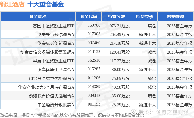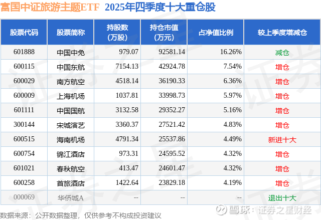 根据2025基金年报公募基金重仓股数据,重仓该股的公募基金共19家,其中持有数量最多的公募基金为富国基金的富国中证旅游主题ETF。富国中证旅游主题ETF目前规模为56.94亿元,最新净值0.6789(3月31日),较上一交易日下跌0.73%,近一年上涨1.75%。该公募基金现任基金经理为曹璐迪 殷钦怡。曹璐迪在任的基金产品包括:富国中证价值ETF联接A,管理时间为2020年5月20日至今,期间收益率为122.28%;富国中证价值ETF,管理时间为2020年5月20日至今,期间收益率为133.47%;富国创业板ETF,管理时间为2020年8月6日至今,期间收益率为16.15%;富国中证科创创业50ETF,管理时间为2021年6月29日至今,期间收益率为-7.09%。殷钦怡在任的基金产品包括:富国中证细分化工产业主题ETF发起式联接A,管理时间为2024年7月23日至今,期间收益率为61.37%;富国中证全指证券公司ETF,管理时间为2024年7月23日至今,期间收益率为29.64%;富国中证细分化工产业主题ETF,管理时间为2024年7月23日至今,期间收益率为66.21%;富国中证全指建筑材料ETF,管理时间为2024年7月23日至今,期间收益率为24.02%。