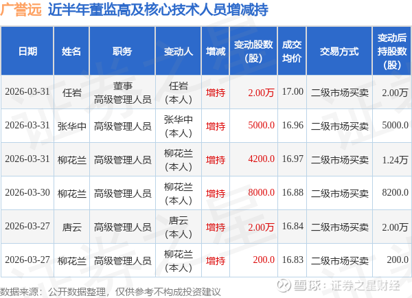 广誉远近半年内的董监高及核心技术人员增减持详情如下: