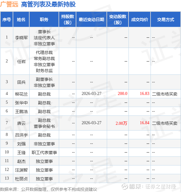 广誉远的高管列表及最新持股情况如下: