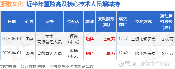 证券之星消息,根据4月1日市场公开信息、上市公司公告及交易所披露数据整理,浙数文化(600633)最新董监高及相关人员股份变动情况:2026年4月1日公司董事,高级管理人员何锋、高级管理人员梁楠共增持公司股份3.0万股,占公司总股本为0.0024%。变动期间公司股价上涨2.98%,4月1日当日收盘报12.46元。
