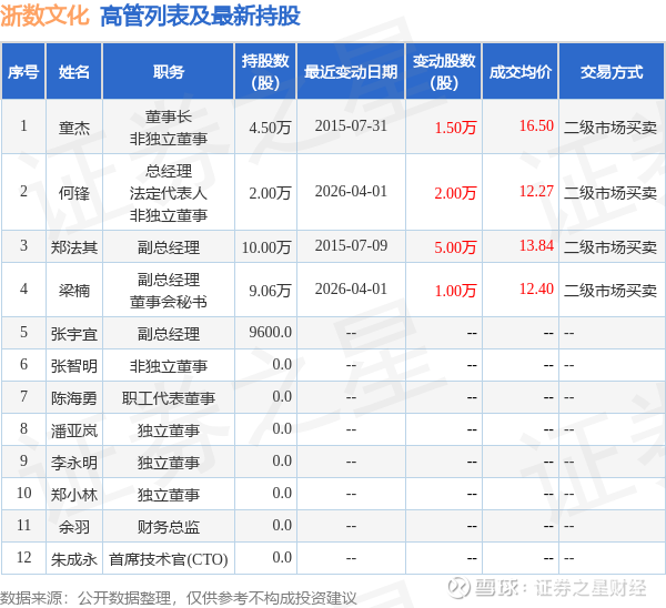 浙数文化近半年内的董监高及核心技术人员增减持详情如下: