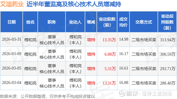 证券之星消息,根据4月1日市场公开信息、上市公司公告及交易所披露数据整理,艾迪药业(688488)最新董监高及相关人员股份变动情况:2026年3月31日公司董事,核心技术人员傅和亮共增持公司股份13.35万股,占公司总股本为0.0317%。变动期间公司股价下跌4.26%,3月31日当日收盘报14.85元。