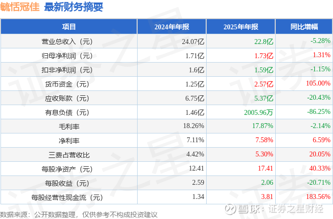 管理费用变动幅度为18.65%,原因:上市媒体费用和毓恬冠佳汽车科技新厂房竣工验收后新增折旧费用。财务费用变动幅度为-42.25%,原因:银行贷款已全部归还未再续贷。研发费用变动幅度为-16.12%,原因:研发材料和试验发生减少。经营活动产生的现金流量净额变动幅度为278.08%,原因:受2024年启用“新一代票据业务系统”的影响,流入和流出分别减少-33.89%和-49.47%。投资活动产生的现金流量净额变动幅度为-164.25%,原因:新增闲置资金用于购买理财产品增加,产品到期和购买产生的现金流入和流出增加。筹资活动产生的现金流量净额变动幅度为707.06%,原因:2025年公司首次发行股票,募集资金到账。货币资金变动幅度为105.0%,原因:理财认购间歇期。应收款项变动幅度为-20.43%,原因:营业收入减少。投资性房地产的变动原因:子公司厂房对外出租,转为投资性房地产。固定资产变动幅度为37.42%,原因:报告期新厂房竣工验收,子公司厂房对外出租,转为投资性房地产。在建工程变动幅度为-98.78%,原因:报告期新厂房竣工验收。短期借款变动幅度为-100.0%,原因:报告期偿还借款。合同负债变动幅度为289.16%,原因:预收账款模式的客户订单量增加。长期借款变动幅度为-100.0%,原因:报告期归还全资子公司毓恬冠佳汽车科技新厂房专项贷款。交易性金融资产变动幅度为311.11%,原因:报告期增加理财产品购买。应收票据变动幅度为-94.85%,原因:报告期末直接背书的未到期地方商业银行银行承兑汇票减少。应收款项融资变动幅度为32.59%,原因:期末持有的信用等级较高的银行承兑汇票增加。其他流动资产变动幅度为-47.93%,原因:分、子公司留抵进项税额减少。其他权益工具投资的变动原因:报告期认购嘉兴隽辉股权投资合伙企业(有限合伙)份额。无形资产变动幅度为-24.07%,原因:子公司厂房出租,土地使用权转入投资性房地产。应付票据变动幅度为-97.09%,原因:信用开票到期。其他应付款变动幅度为77.86%,原因:子公司厂房出租收取的“保证金”。其他流动负债变动幅度为-95.16%,原因:报告期末直接背书的未到期地方商业银行银行承兑汇票减少。证券之星价投圈财报分析工具显示: