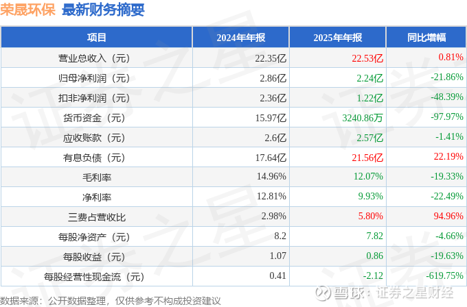 据证券之星公开数据整理,近期荣晟环保(603165)发布2025年年报。截至本报告期末,公司营业总收入22.53亿元,同比上升0.81%,归母净利润2.24亿元,同比下降21.86%。按单季度数据看,第四季度营业总收入6.44亿元,同比上升12.4%,第四季度归母净利润5283.15万元,同比上升40.64%。本报告期荣晟环保公司应收账款体量较大,当期应收账款占最新年报归母净利润比达114.73%。